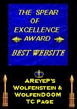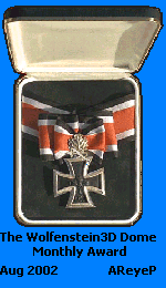 "Wolfenstein 3D", "Wolfenstein Spear of Destiny", the "Wolfenstein 3D" logo, "Doom", and all images or content taken from them are Copyright id software, creators of the legendary Doom and Quake series of games. To check out or order other great games by id, visit www.idsoftware.com. You can also purchase the original Wolfenstein 3D (definitely well worth it!), or its sequel "Spear of Destiny", from id software's site. These classic games are cheap these days - you have no excuse! |